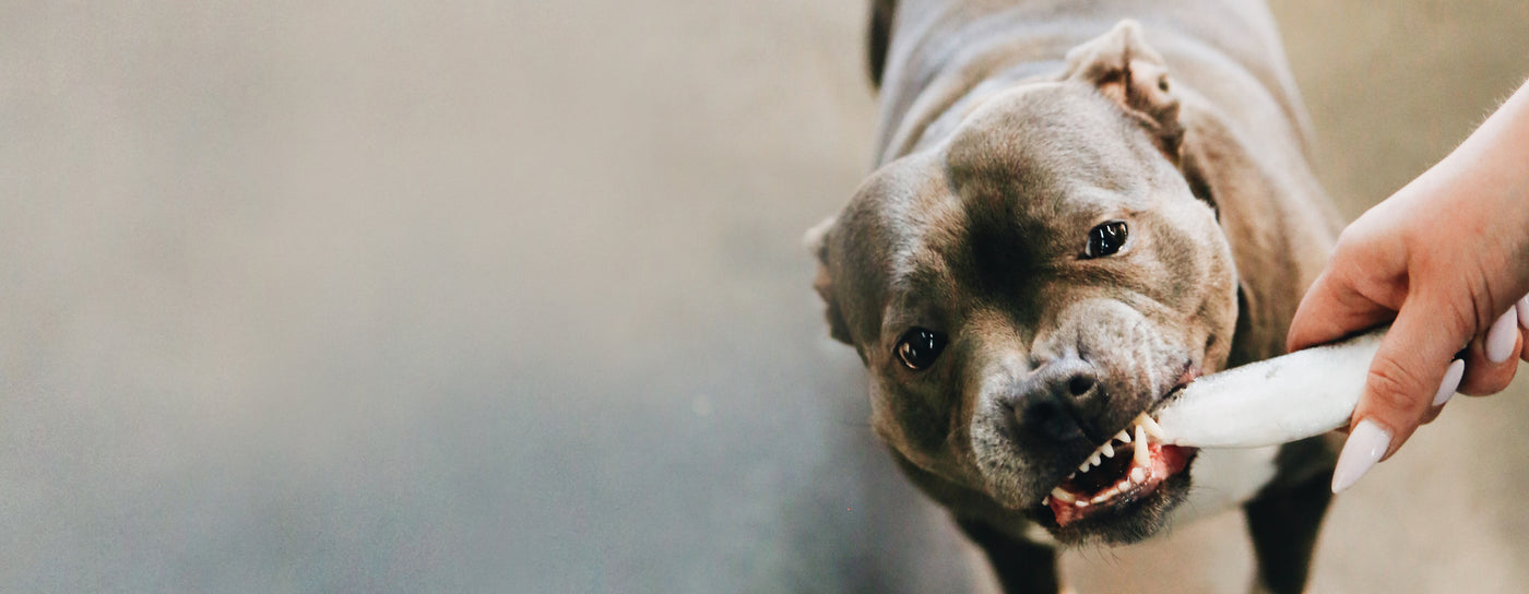 To reduce the risk of your dog getting overly excited and attempting to swallow a bone whole, always choose a bone that is much larger than their mouth. In the beginning, we recommend starting with a knuckle bone roughly the size of your dog’s head. This encourages slow, controlled chewing and builds good habits.